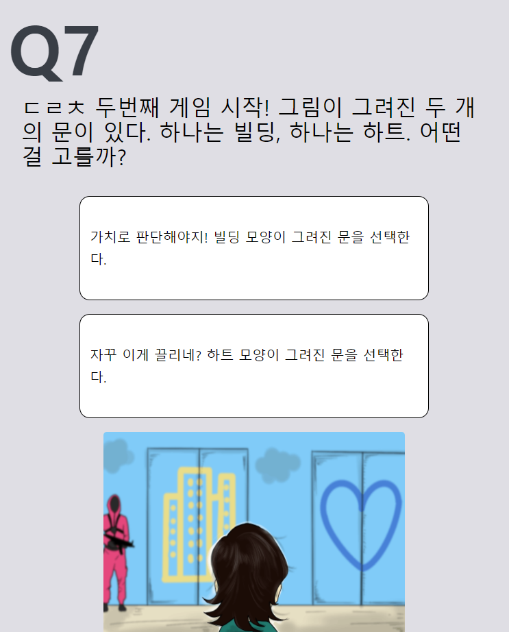 Q. ㄷㄹㅊ 두번째 게임 시작! 그림이 그려진 두 개의 문이 있다. 하나는 빌딩, 하나는 하트. 어떤 걸 고를까?