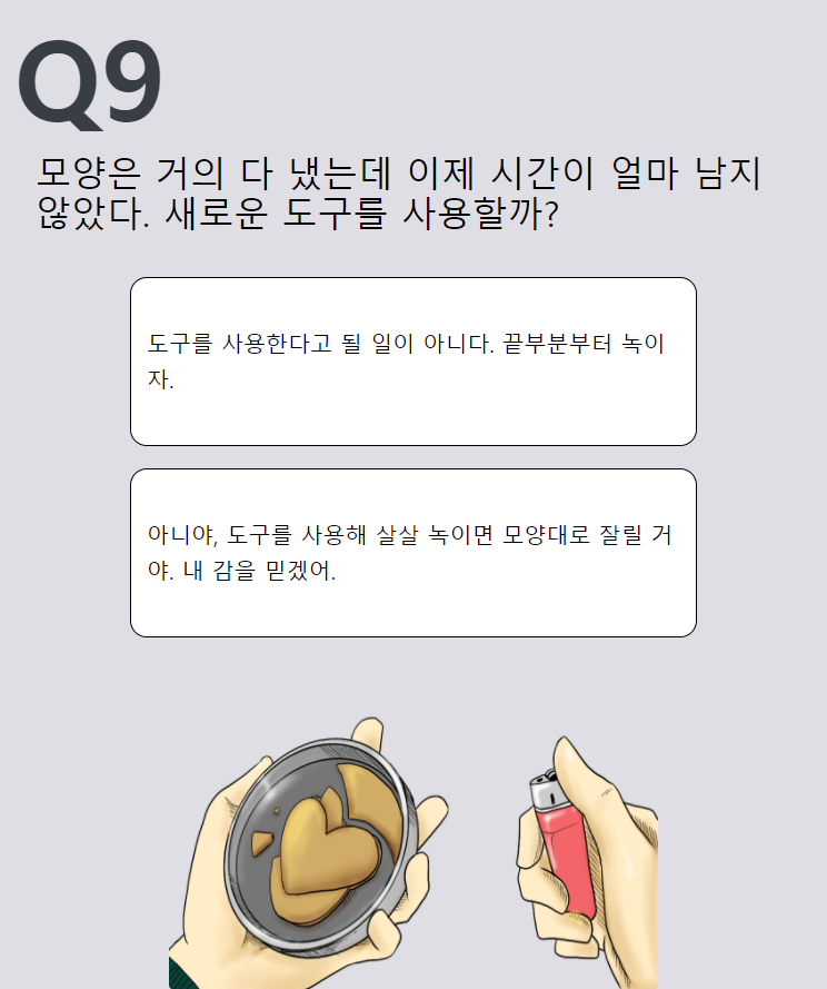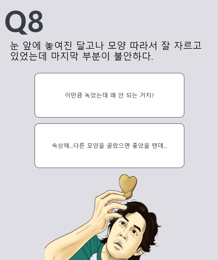 Q. 눈 앞에 놓여진 달고나 모양 따라서 잘 자르고 있었는데 마지막 부분이 불안하다.