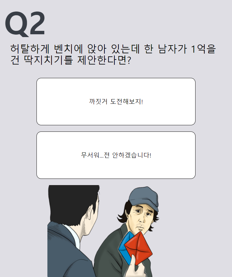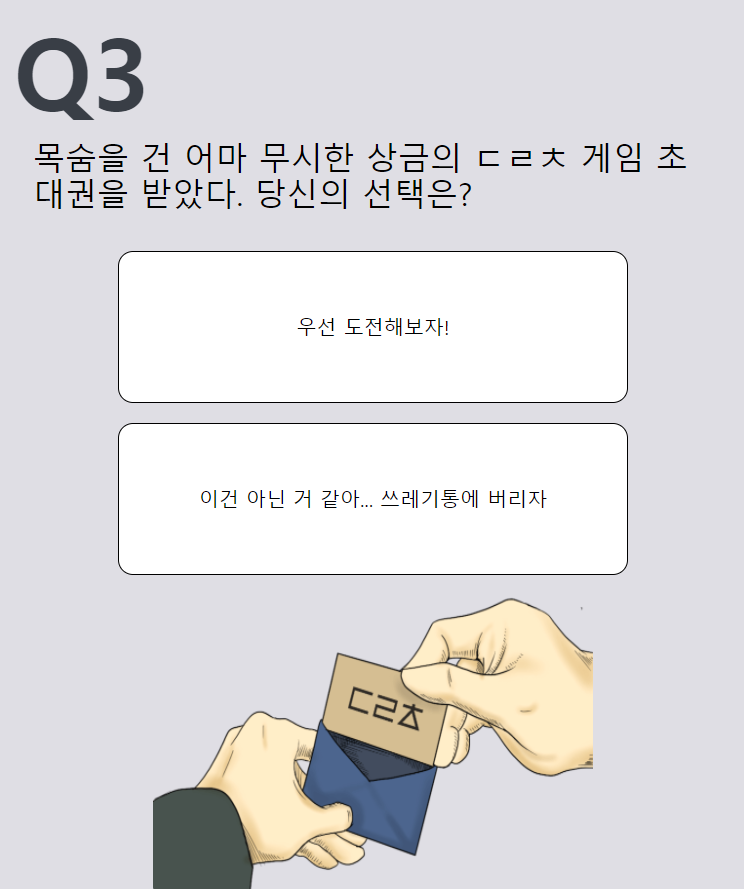 Q. 목숨을 건 어마 무시한 상금의 ㄷㄹㅊ 게임 초대권을 받았다. 당신의 선택은?
