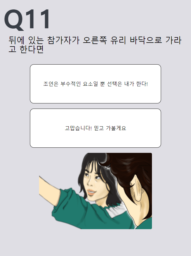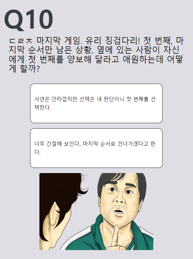 Q. ㄷㄹㅊ 마지막 게임. 유리 징검다리! 첫 번째, 마지막 순서만 남은 상황, 옆에 있는 사람이 자신에게 첫 번째를 양보해 달라고 애원하는데 어떻게 할까?
